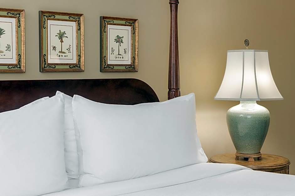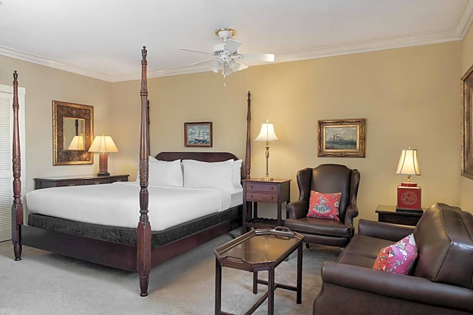 This room has air conditioning, a flat-screen TV, and refrigerator. The seating area includes and sofa and chair.